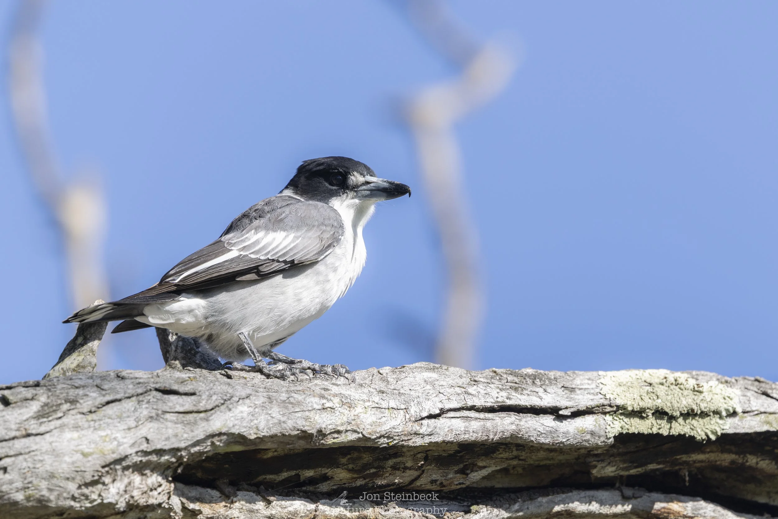 The movement of this Grey butcherbird (Cracticus torquatus) descending quickly from a tree caught my attention. The bird, landed briefly, then flew back up to a branch with a dragonfly in its mouth. It hit the dragonfly a few times on the branch, before it turned the insect headfirst and consumed it. Unfortunately, I was not in a good place to photograph that, but the bird stayed on the branch long enough to allow me to move around to photograph it with the sun behind me. It was a beautiful looking bird with its sober monotone plumage. Butcherbirds get their names from their behaviour where they will store prey on the ends of broken branches or use it as a hook to help it tear the food up, just as a butcher may store meat or cut it on a meat hook.