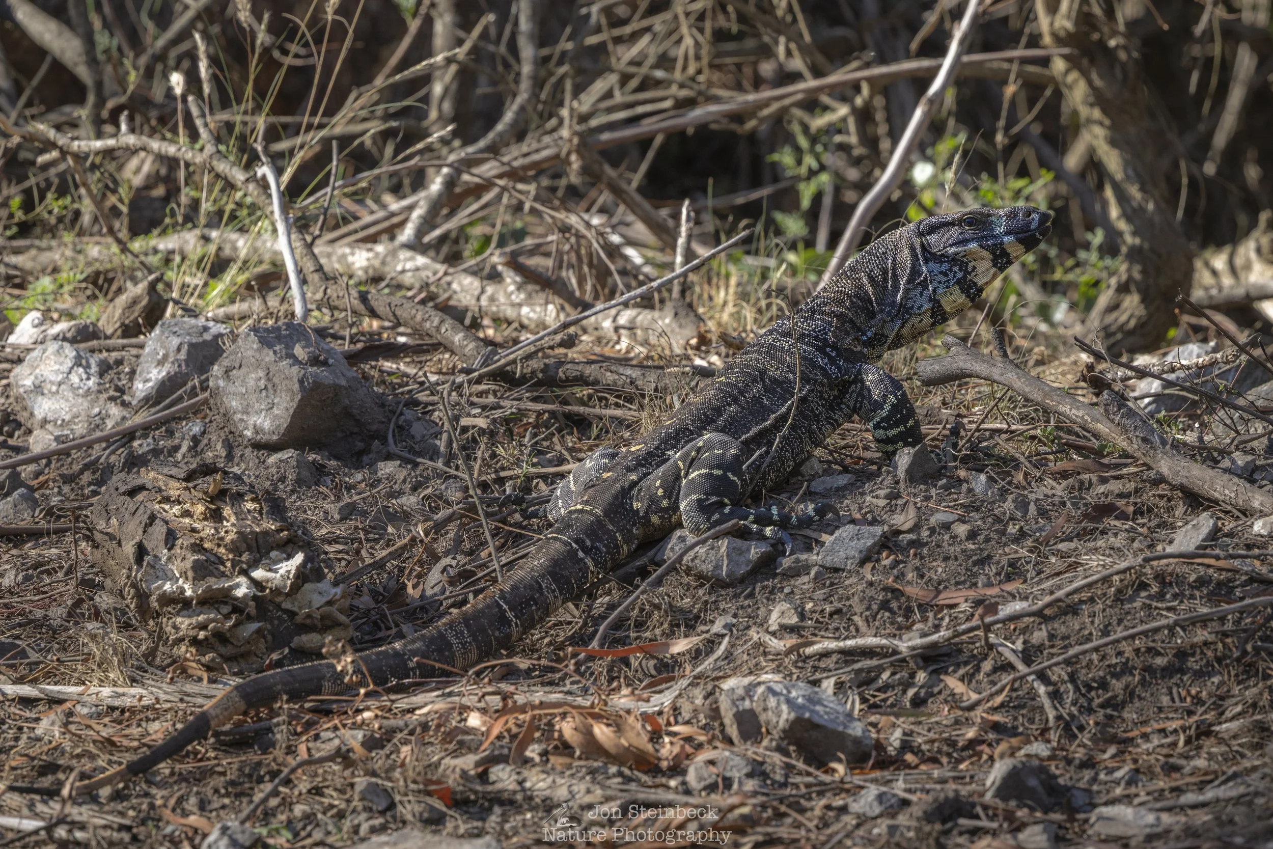 Lace Monitors (Varanus varius) are Australia’s second largest lizard species with individuals growing up to two metres in length. Despite their size, they are very good climbers, able to scale vertical trees thanks to their sharp claws. Beyond those claws, scientists have discovered that Lace Monitors, along with other monitors, actually have venom, but it is unlikely to kill a human, although it will lead to local swelling and pain. Lace Monitors are close relatives of Indonesia’s famous Komodo Dragons, with both species having evolved from a common ancestor over 10 million years ago. I had been keeping an eye out for this lizard and one morning in January I found it when I was driving along a dirt back road at Narooma. The monitor was sunning itself on the dirt road when I drove along. After I saw it, I slowed the car down and pulled off to the opposite side of the road. I took a few shots from the car window while the lizard stayed on the road looking at me. I was not in a great spot for lighting so I left the car and moved forward of the lizard. My movement made the lizard head slowly for the bush, where it stopped again to look at me. It was probably over a metre, so not fully grown, and not too sure about humans. It stayed on the edge of the bush for a little while, allowing me to move to the better lit side of the lizard and to to get down to its eye level. I was really happy with the encounter, and I stayed put for a little while just admiring this legendary lizard.