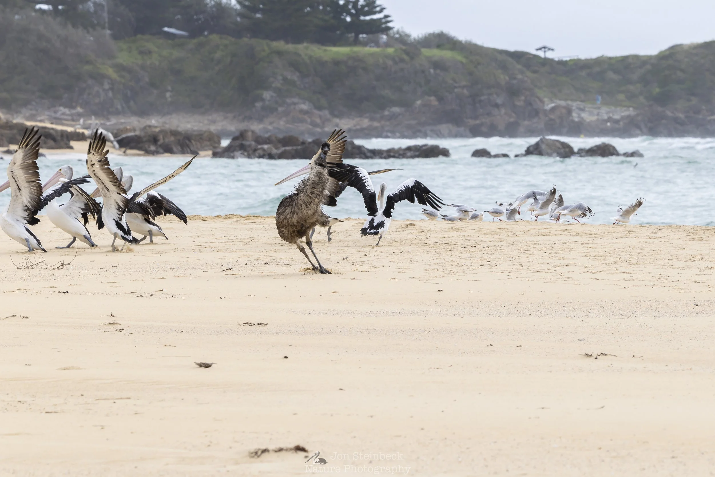 I followed it while it walked along feeding. Emus eat plants and this one was taking leaves and also bending right down to eat the low shrubs. It would open its beak wide, exposing a red mouth, before snapping shut on the leaves and pulling back. It would then open its beak again, and the leaves would be in mid-air within its beak, almost like it was using that opening motion to throw the leaves further back down its throat. At one stage, it came across an Eastern Grey joey that must have been out of the pouch for a while but the joey didn’t move far enough away from the Emu that was moving through the long grass and the Emu attacked it. I could see the Emu leaping in the air while the joey flailed around the in the long grass. I thought I heard hissing but I am not sure. Much later, once the Emu was on the wide South Tuross Beach proper, it walked across to the oceanside, where a group of Australian Pelicans were already resting. The pelicans looked a little uncertain when the Emu got nearer and some started to move to make room for the larger bird. Then some of the smaller pelicans must have become spooked and took off, in turn frightening the Emu, which turned and started running with the remnants of its wings giving it balance. When the Emu realised that it wasn’t being threatened and most of the pelicans had flown off, it turned and charged at some the remaining pelicans who took to the sky, easily escaping the flightless bird.